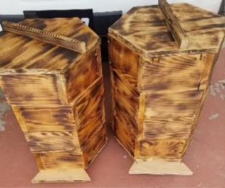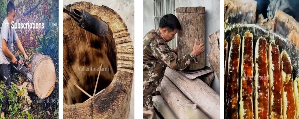 Ironically, that method has recently re-emerged as a practice from Ancient China. The beekeepers cut a section of a felled tree trunk, cut a cover out of it, then drill out the core, make small entrances around the rim of the trunk, scorch it, line with melted beeswax and the place in a location as a swarm trap.1,2